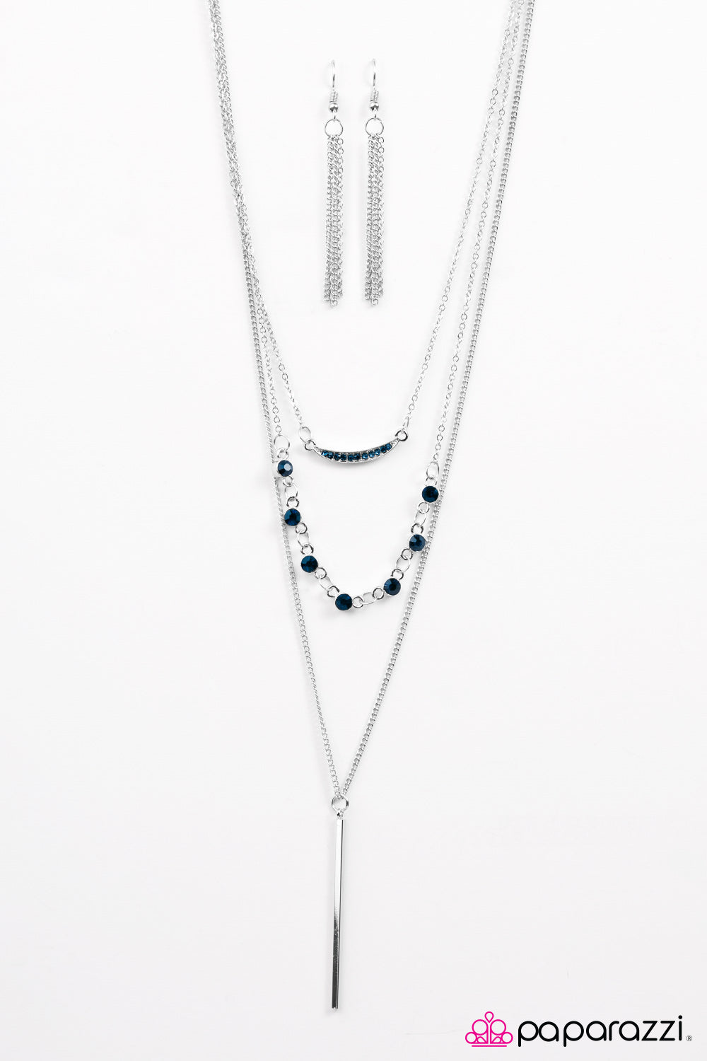 Three shimmery silver chains fall down the chest, creating an elongated layered display. A rhinestone encrusted crescent swings from the uppermost chain above a row of glittery blue rhinestones and a skinny silver rod. Features an adjustable clasp closure.
