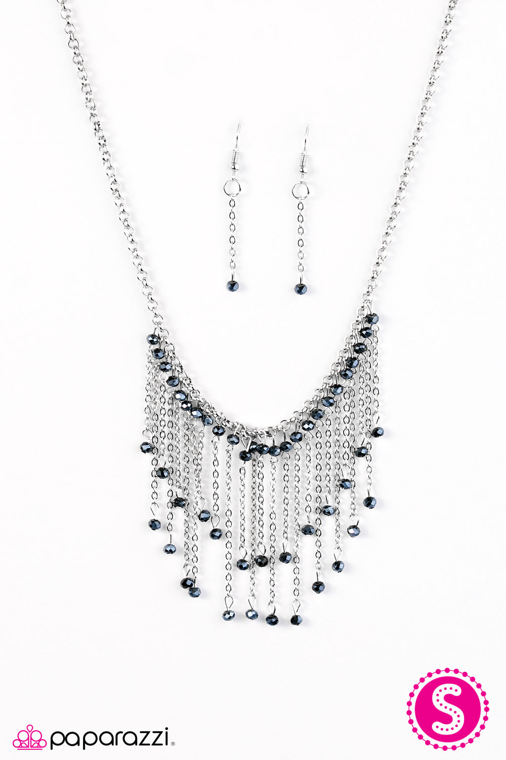 A row of sparkling midnight blue beads give way to trestles of freefalling silver chains. Featuring varied lengths, the sparkling fringe flawlessly falls into a beautifully tapered palette as additional beads twinkle at the ends. Features an adjustable clasp closure.